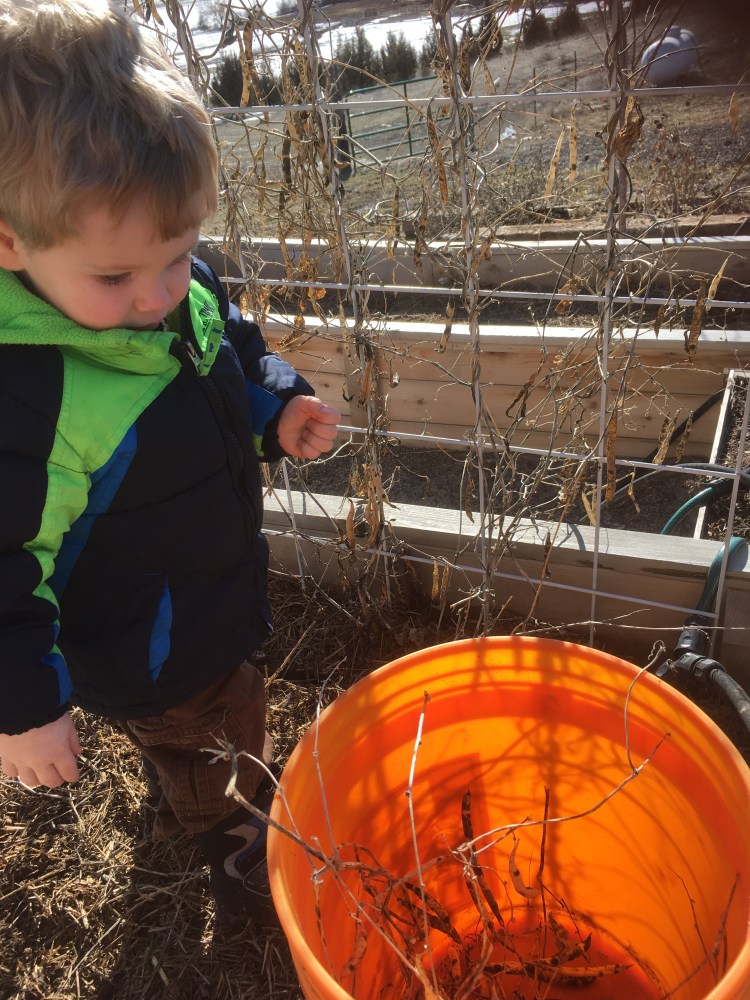 First we had to take down the old, dead bean vines from last year. He loved picking beans off and then dumping his own little bucket of trash to the chickens.