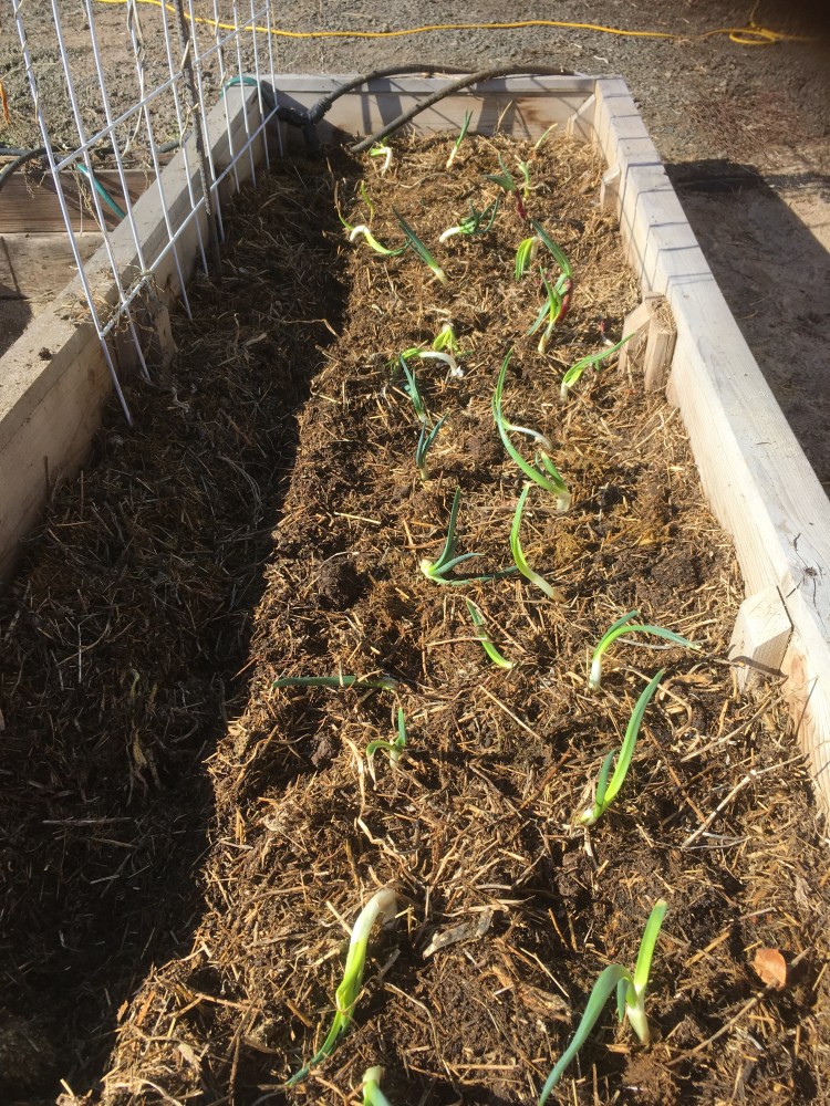 The onions in the kitchen were growing, and, since there are also some sprouting in the garden, I thought I should divide them up and plant them. Davy was here, and was very excited at the idea of “playing gardens”.